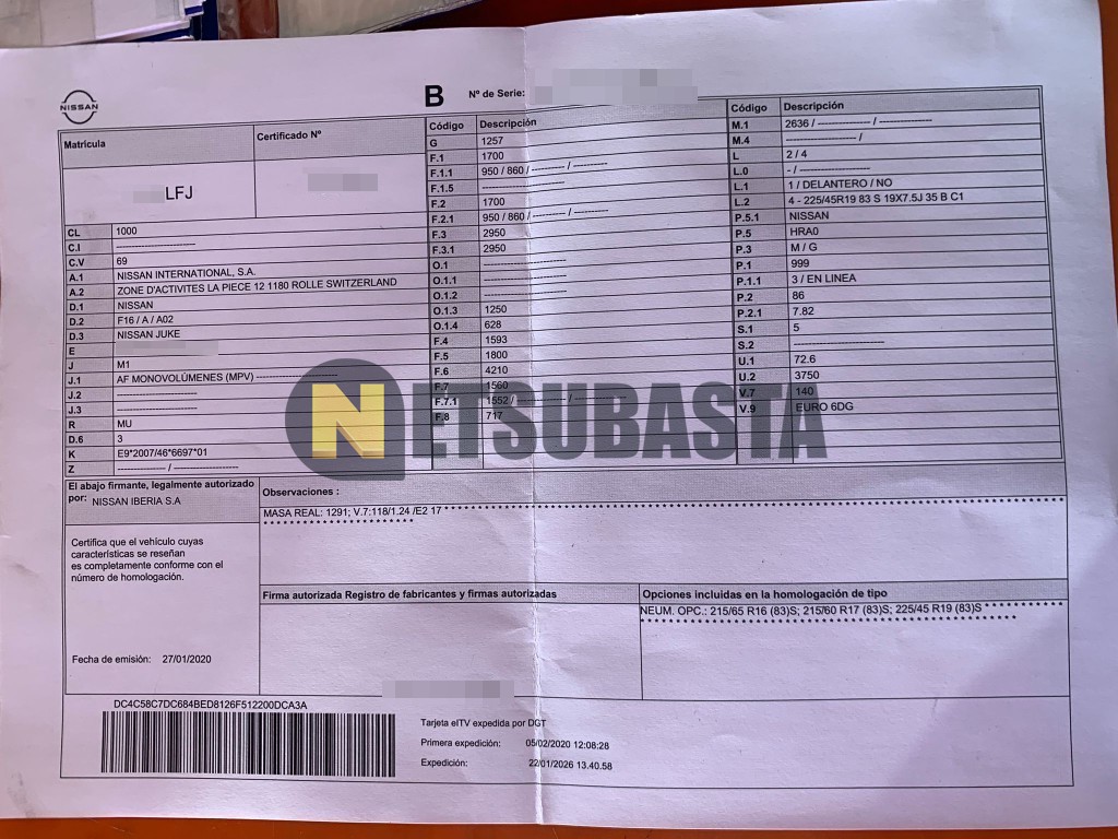 Subasta de Nissan Juke 1.0 DIG-T 2020 Averiados, Marca Nissan, Modelo Juke 1.0 DIG-T, Combustible Gasolina, Kilometraje 121.000 KM, Fecha 1ª matriculación 02/2020, Matrícula ****LFJ, Color Exterior , Color Interior , IVA REBU y Ubicación Madrid.