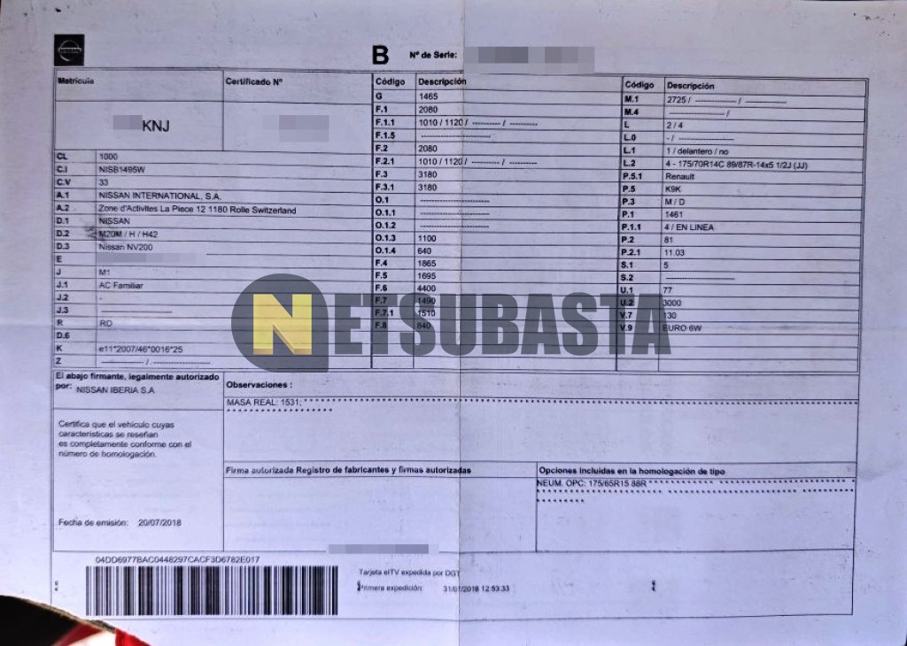 Subasta de Nissan NV200 Evalia 1.5 dCi 2018 Siniestrados, Marca Nissan, Modelo NV200 Evalia 1.5 dCi, Combustible Diésel, Kilometraje 170.000 KM, Fecha 1ª matriculación 07/2018, Matrícula ****KNJ, Color Exterior , Color Interior , IVA REBU y Ubicación Madrid.