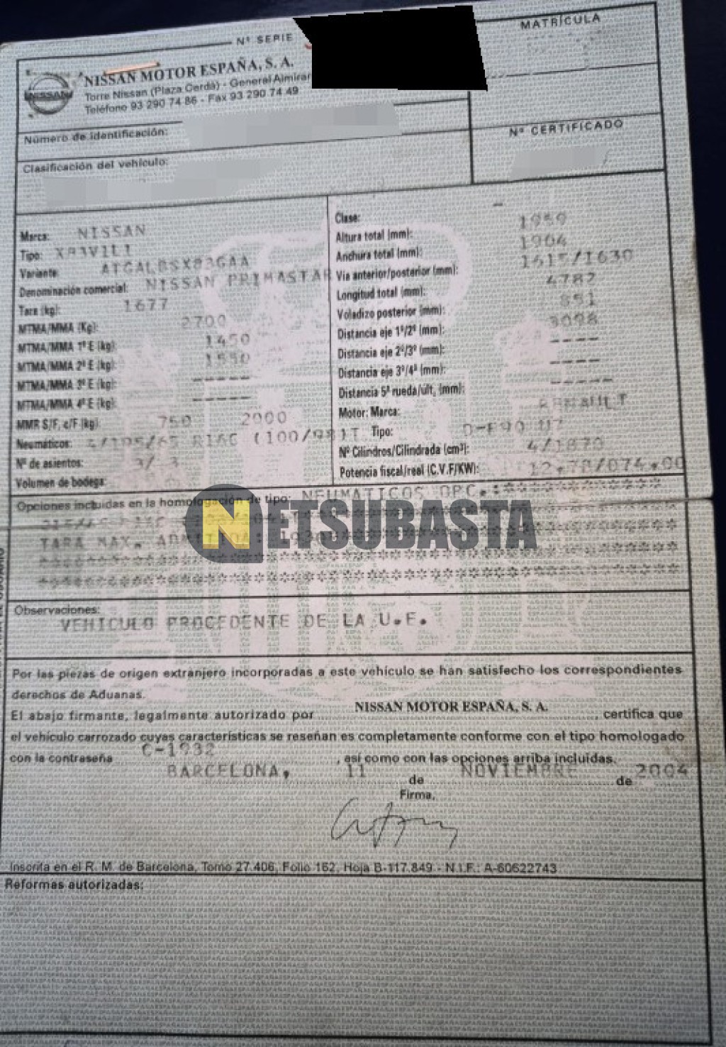 Subasta de Nissan Primastar 1.9 dCi 2005 Averiados, Marca Nissan, Modelo Primastar 1.9 dCi, Combustible Diésel, Kilometraje 590.000 KM, Fecha 1ª matriculación 01/2005, Matrícula ****DFY, Color Exterior , Color Interior , IVA REBU y Ubicación Gerona.