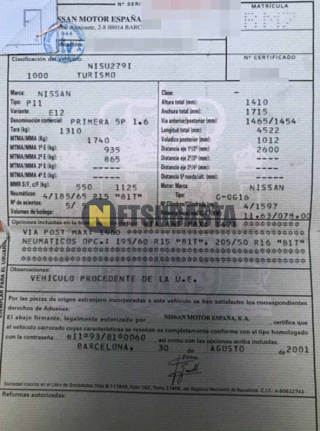 Subasta de Nissan Primera 1.6 2001 Averiados, Marca Nissan, Modelo Primera 1.6 , Combustible Gasolina, Kilometraje 285.000 KM, Fecha 1ª matriculación 09/2001, Matrícula ****BMZ, Color Exterior , Color Interior , IVA REBU y Ubicación Madrid.