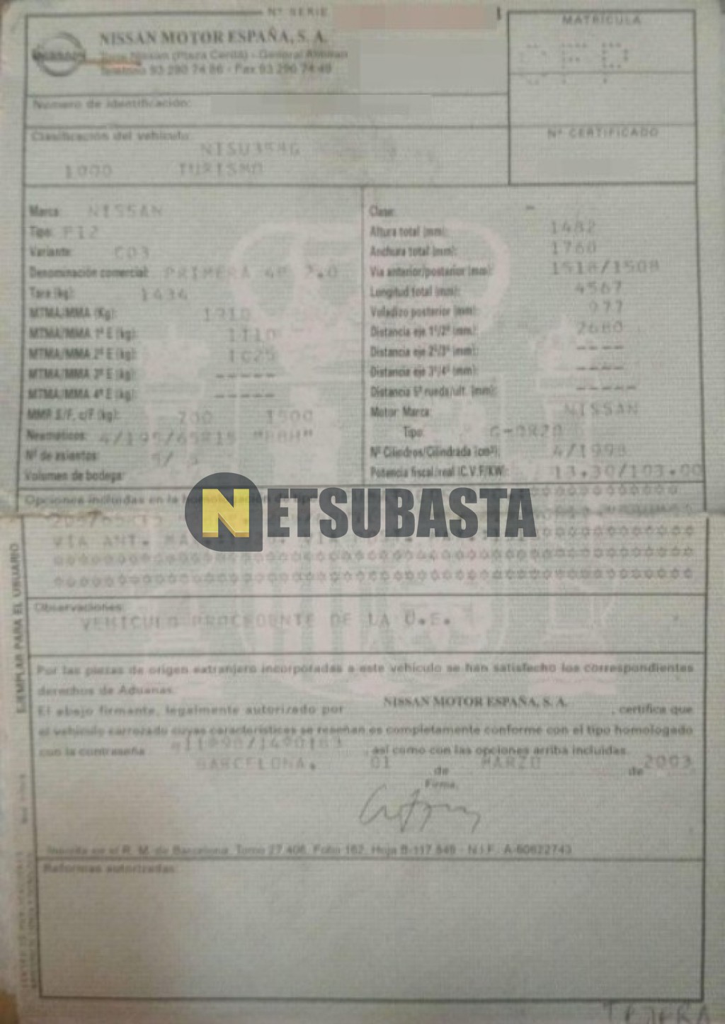 Subasta de Nissan Primera 2.0 2003 Siniestrados, Marca Nissan, Modelo Primera 2.0, Combustible Gasolina, Kilometraje 243.000 KM, Fecha 1ª matriculación 03/2003, Matrícula ****CFP, Color Exterior , Color Interior , IVA REBU y Ubicación Castellón.