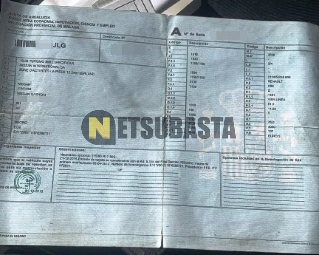 Subasta de Nissan Qashqai 1.5 dCi 4x2 2012 Averiados, Marca Nissan, Modelo Qashqai 1.5 dCi 4x2, Combustible Diésel, Kilometraje 250.000 KM, Fecha 1ª matriculación 04/2012, Matrícula ****JLG, Color Exterior , Color Interior , IVA REBU y Ubicación Huelva.