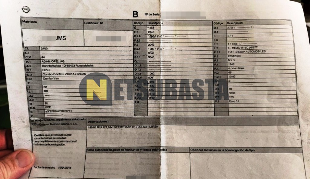 Subasta de Opel Combo Cargo 1.3 CDTI 2016 Averiados, Marca Opel, Modelo Combo Cargo 1.3 CDTI, Combustible Diésel, Kilometraje 100.000 KM, Fecha 1ª matriculación 03/2016, Matrícula ****JMS, Color Exterior , Color Interior , IVA REBU y Ubicación Barcelona.