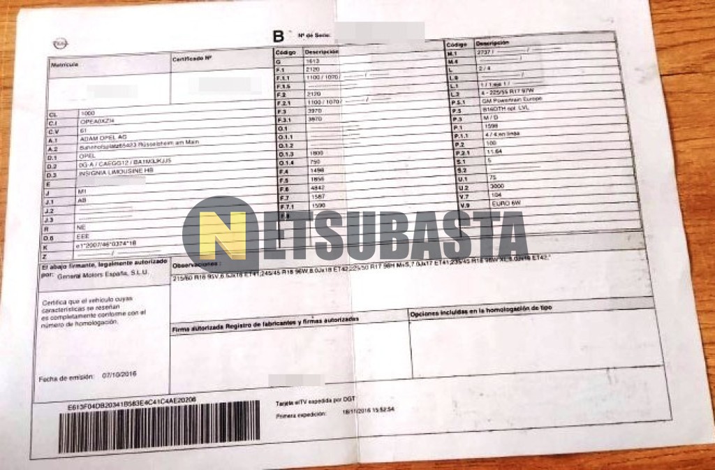 Subasta de Opel Insignia 1.6 CDTI 2016 Averiados, Marca Opel, Modelo Insignia 1.6 CDTI , Combustible Diésel, Kilometraje 257.000 KM, Fecha 1ª matriculación 11/2016, Matrícula ****JTY, Color Exterior , Color Interior , IVA REBU y Ubicación Ciudad Real.