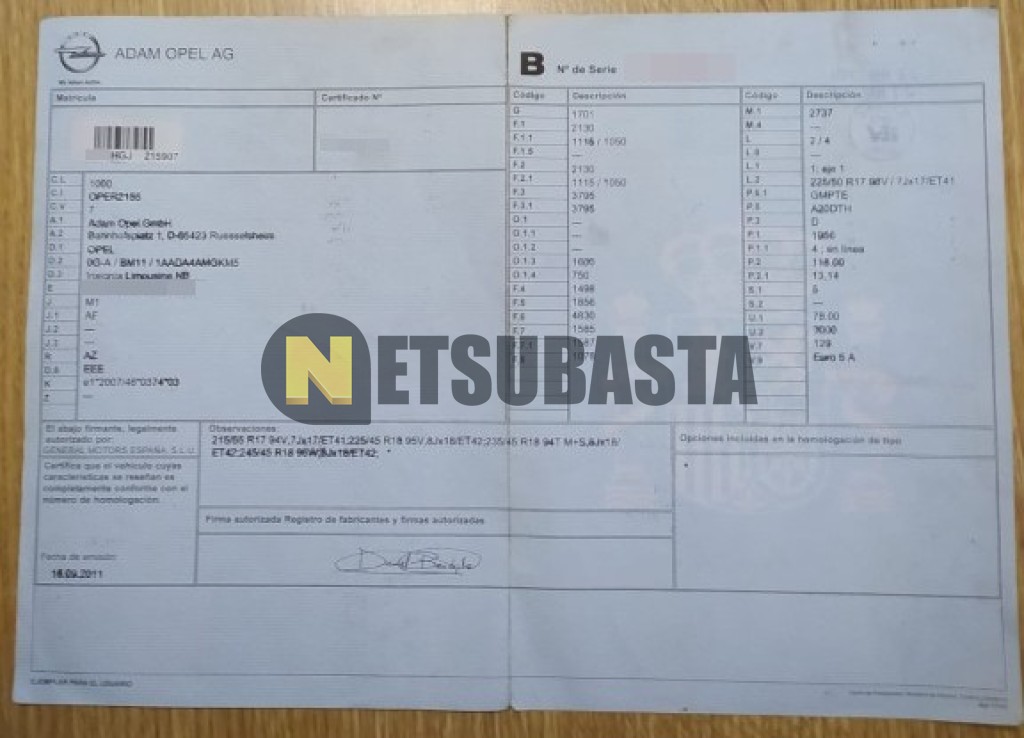 Subasta de Opel Insignia 2.0 CDTI ecoFLEX 2011 Averiados, Marca Opel, Modelo Insignia 2.0 CDTI ecoFLEX, Combustible Diésel, Kilometraje 234.000 KM, Fecha 1ª matriculación 09/2011, Matrícula ****HGJ, Color Exterior , Color Interior , IVA REBU y Ubicación La Coruña.