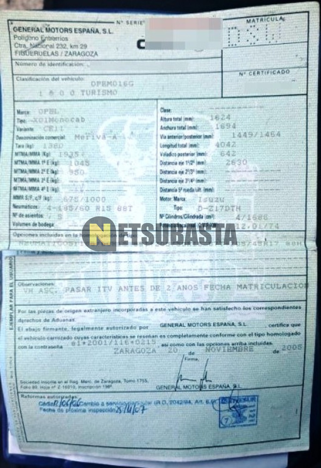 Subasta de Opel Meriva 1.7 CDTi 2005 Averiados, Marca Opel, Modelo Meriva 1.7 CDTi, Combustible Diésel, Kilometraje 203.000 KM, Fecha 1ª matriculación 11/2005, Matrícula ****DSW, Color Exterior , Color Interior , IVA REBU y Ubicación Murcia.