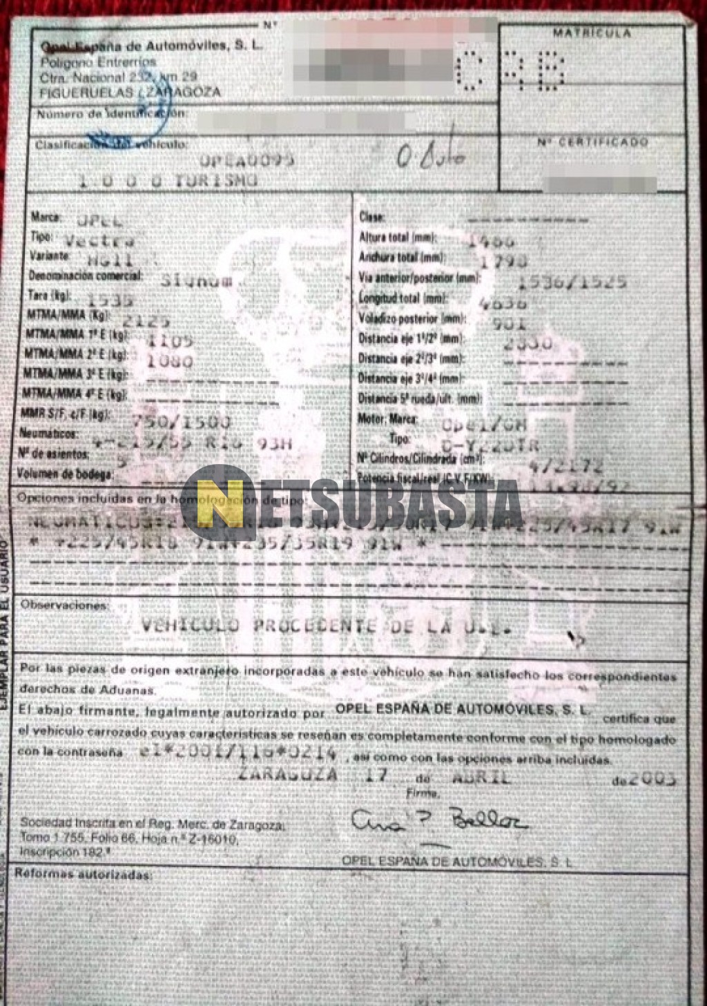 Subasta de Opel Signum 2.2 DTI 16V 2003 Averiados, Marca Opel, Modelo Signum 2.2 DTI 16V, Combustible Diésel, Kilometraje 387.000 KM, Fecha 1ª matriculación 12/2003, Matrícula ****CRB, Color Exterior , Color Interior , IVA REBU y Ubicación Madrid.
