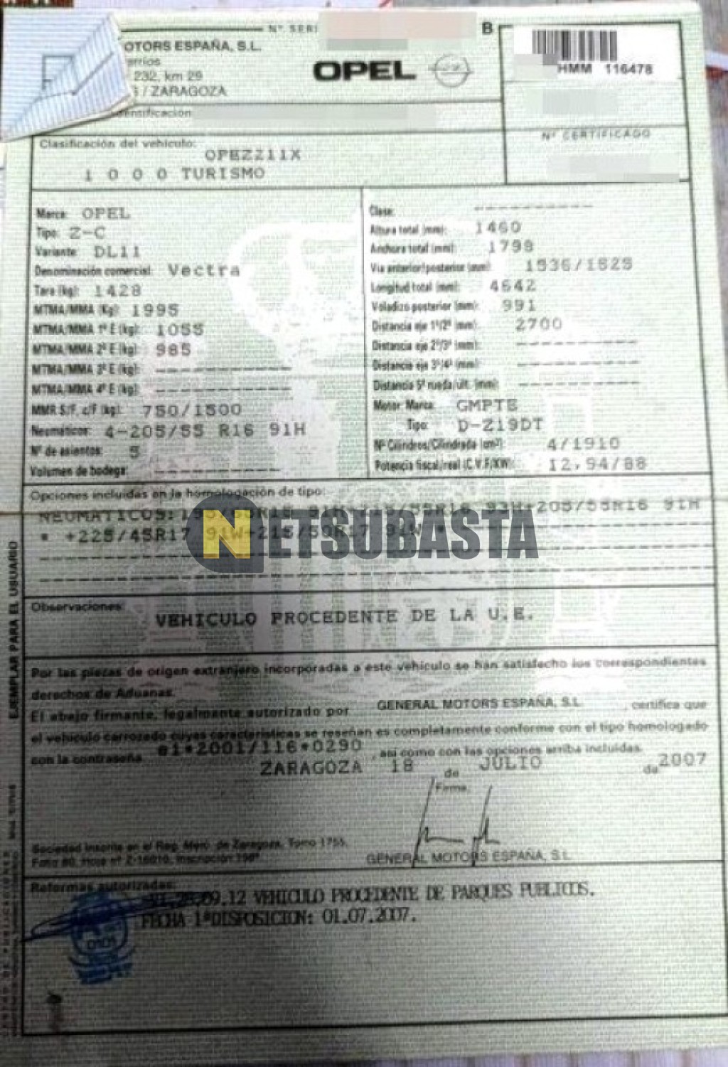 Subasta de Opel Vectra 1.9 CDTI 2007 Averiados, Marca Opel, Modelo Vectra 1.9 CDTI, Combustible Diésel, Kilometraje 202.000 KM, Fecha 1ª matriculación 07/2007, Matrícula ****HMM, Color Exterior , Color Interior , IVA REBU y Ubicación Madrid.
