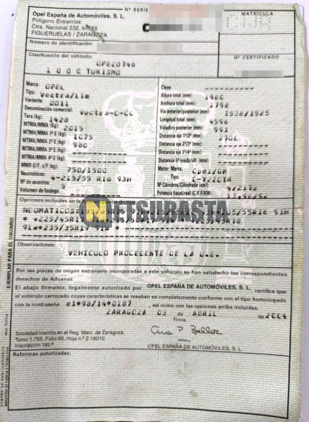 Recuerde que si lo desea, puede imprimir la ficha del vehículo Opel Vectra 2.2 DTi 2004 con todas sus características técnicas.