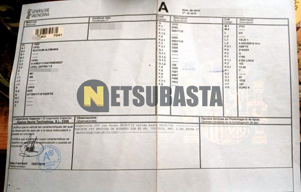 Subasta de Opel Zafira 1.8 16V 2007 Averiados, Marca Opel, Modelo Zafira 1.8 16V, Combustible Gasolina, Kilometraje 255.000 KM, Fecha 1ª matriculación 01/2007, Matrícula ****JRX, Color Exterior , Color Interior , IVA REBU y Ubicación Valencia.