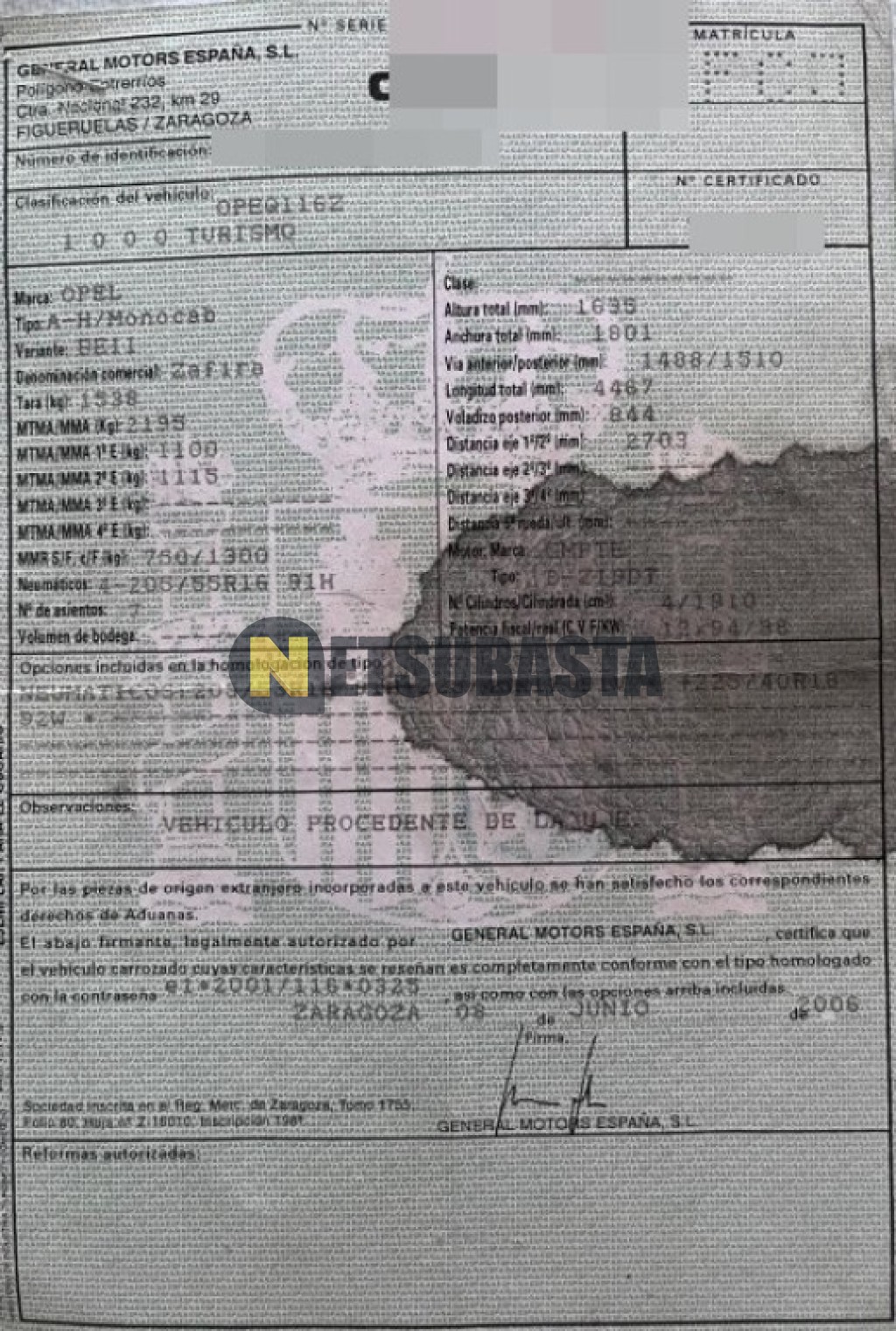 Subasta de Opel Zafira 1.9 CDTI 2006 Averiados, Marca Opel, Modelo Zafira 1.9 CDTI, Combustible Diésel, Kilometraje 355.000 KM, Fecha 1ª matriculación 06/2006, Matrícula ****FCJ, Color Exterior , Color Interior , IVA REBU y Ubicación Guadalajara.