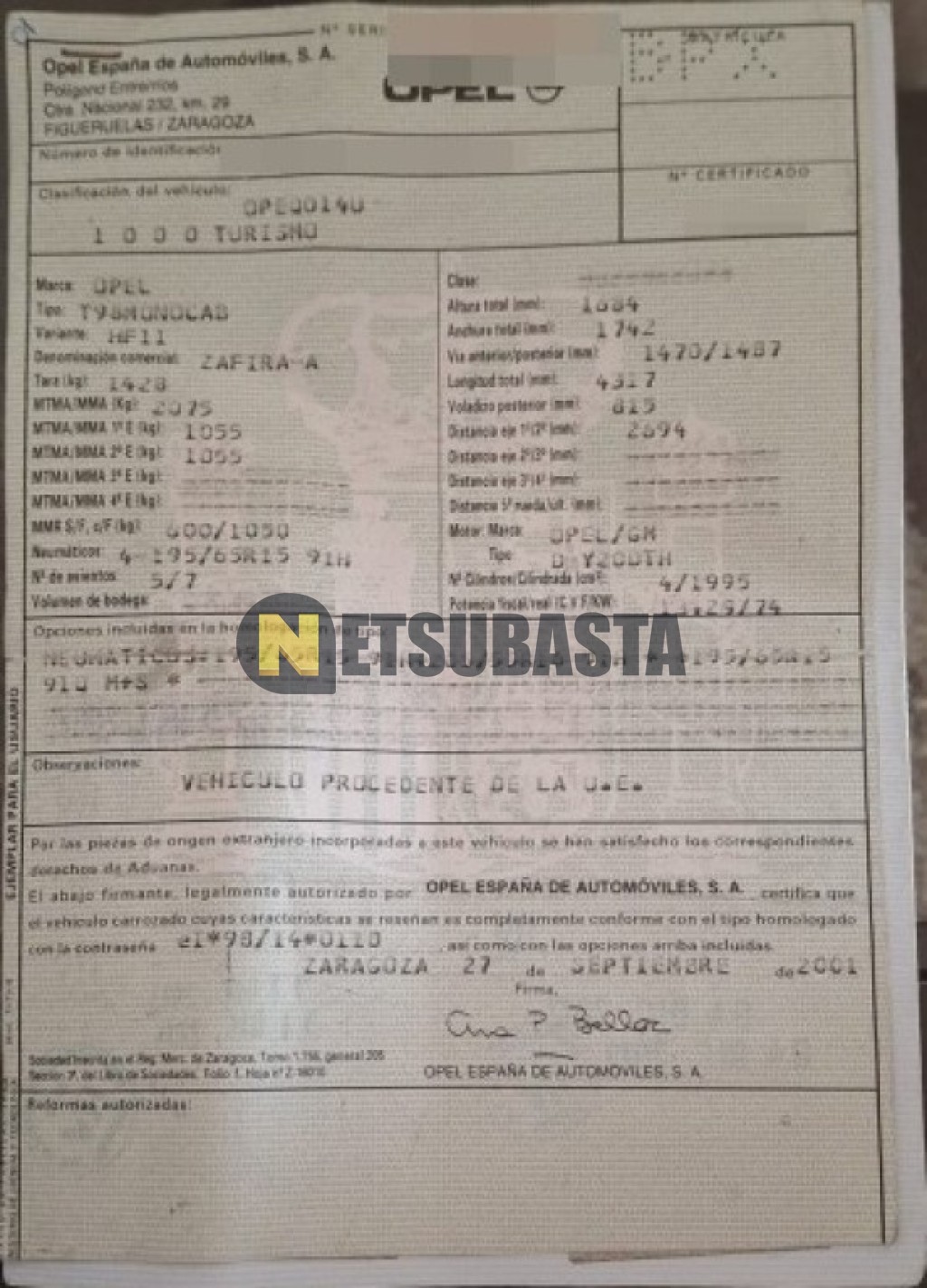 Subasta de Opel Zafira 2.0 DTi 16V 2001 Averiados, Marca Opel, Modelo Zafira 2.0 DTi 16V, Combustible Diésel, Kilometraje 175.000 KM, Fecha 1ª matriculación 11/2001, Matrícula ****BPX, Color Exterior , Color Interior , IVA REBU y Ubicación Toledo.