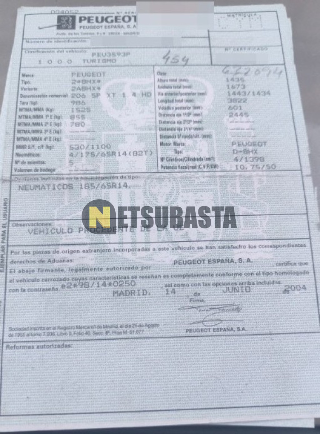 Subasta de Peugeot 206 1.4 HDi 2004 Averiados, Marca Peugeot, Modelo 206 1.4 HDi, Combustible Diésel, Kilometraje 380.000 KM, Fecha 1ª matriculación 07/2004, Matrícula ****CYM, Color Exterior , Color Interior , IVA REBU y Ubicación Jaén.
