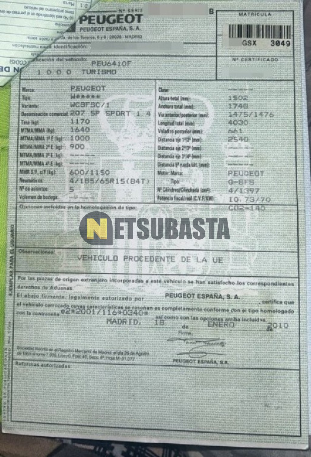 Subasta de Peugeot 207 1.4 VTi 2010 Averiados, Marca Peugeot, Modelo 207 1.4 VTi, Combustible Gasolina, Kilometraje 140.000 KM, Fecha 1ª matriculación 01/2010, Matrícula ****GSX, Color Exterior , Color Interior , IVA REBU y Ubicación Barcelona.