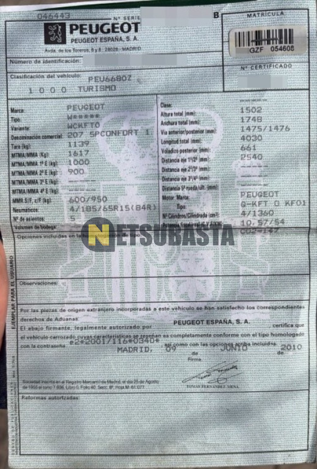 Subasta de Peugeot 207 1.4i 2010 Averiados, Marca Peugeot, Modelo 207 1.4i, Combustible Gasolina, Kilometraje 152.000 KM, Fecha 1ª matriculación 10/2010, Matrícula ****GZF, Color Exterior , Color Interior , IVA REBU y Ubicación Valencia.