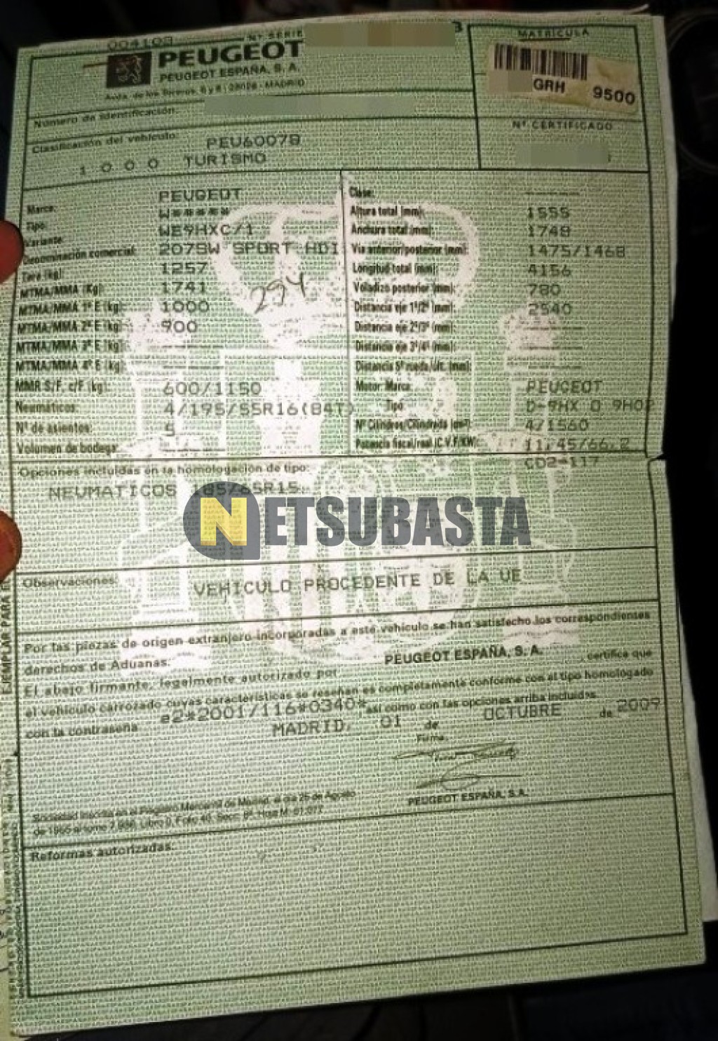 Subasta de Peugeot 207 SW 1.6 HDI 2009 Averiados, Marca Peugeot, Modelo 207 SW 1.6 HDI, Combustible Diésel, Kilometraje 220.000 KM, Fecha 1ª matriculación 10/2009, Matrícula ****GRH, Color Exterior , Color Interior , IVA REBU y Ubicación Málaga.