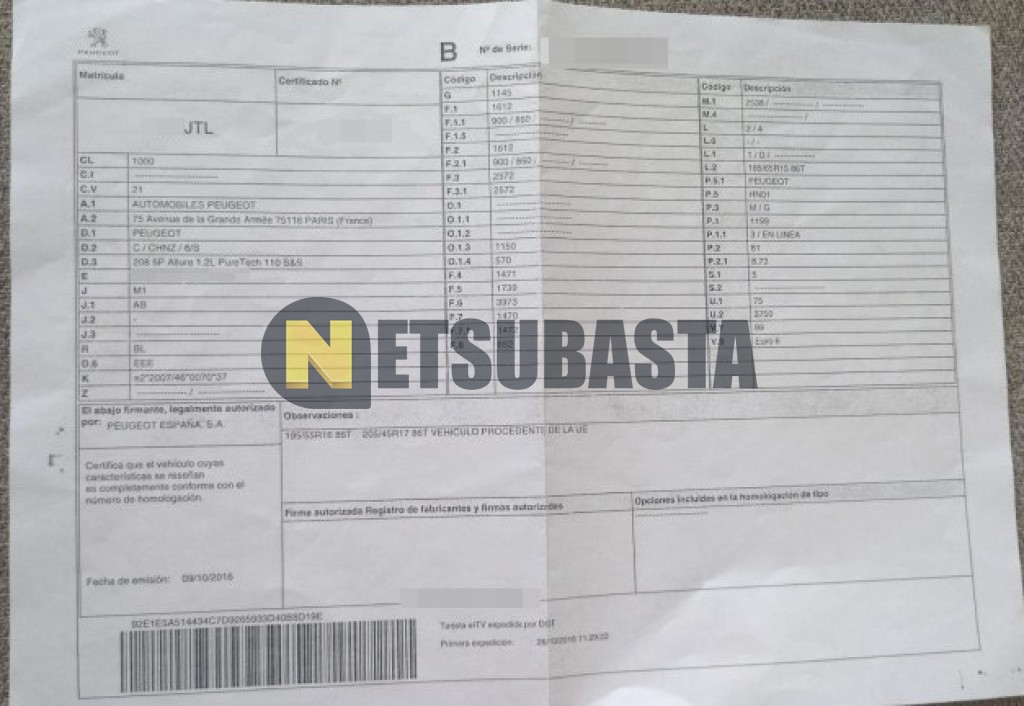 Subasta de Peugeot 208 1.2 PureTech 2016 Siniestrados, Marca Peugeot, Modelo 208 1.2 PureTech , Combustible Gasolina, Kilometraje 125.000 KM, Fecha 1ª matriculación 10/2016, Matrícula ****JTL, Color Exterior , Color Interior , IVA REBU y Ubicación La Coruña.