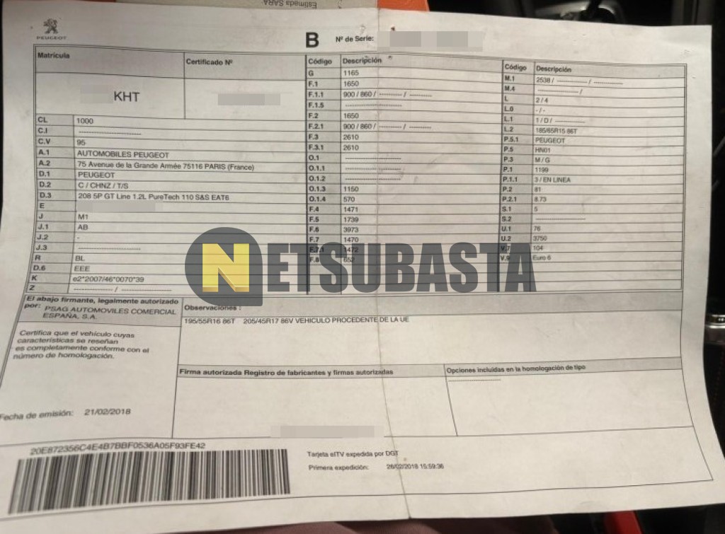Subasta de Peugeot 208 1.2 PureTech EAT6 2018 Averiados, Marca Peugeot, Modelo 208 1.2 PureTech EAT6, Combustible Gasolina, Kilometraje 73.000 KM, Fecha 1ª matriculación 02/2018, Matrícula ****KHT, Color Exterior , Color Interior , IVA REBU y Ubicación Madrid.