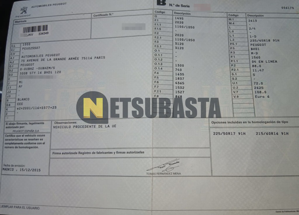 Subasta de Peugeot 3008 1.6 BlueHDi 2015 Siniestrados, Marca Peugeot, Modelo 3008 1.6 BlueHDi, Combustible Diésel, Kilometraje 170.000 KM, Fecha 1ª matriculación 12/2015, Matrícula ****JKV, Color Exterior , Color Interior , IVA REBU y Ubicación Badajoz.