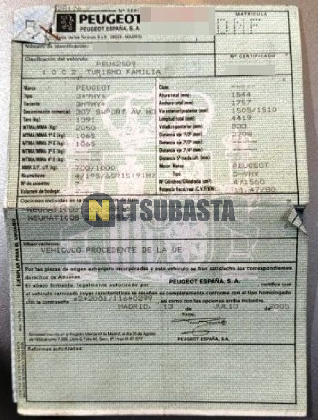 Subasta de Peugeot 307 SW 1.6 HDi 2005 Averiados, Marca Peugeot, Modelo 307 SW 1.6 HDi, Combustible Diésel, Kilometraje 352.000 KM, Fecha 1ª matriculación 07/2005, Matrícula ****DNF, Color Exterior , Color Interior , IVA REBU y Ubicación Madrid.