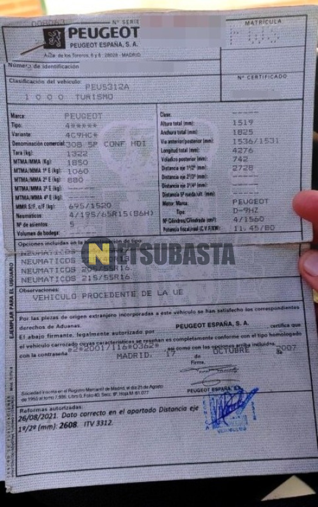 Subasta de Peugeot 308 1.6 HDi FAP 2007 Averiados, Marca Peugeot, Modelo 308 1.6 HDi FAP, Combustible Diésel, Kilometraje 375.000 KM, Fecha 1ª matriculación 10/2007, Matrícula ****FWS, Color Exterior , Color Interior , IVA REBU y Ubicación Asturias.