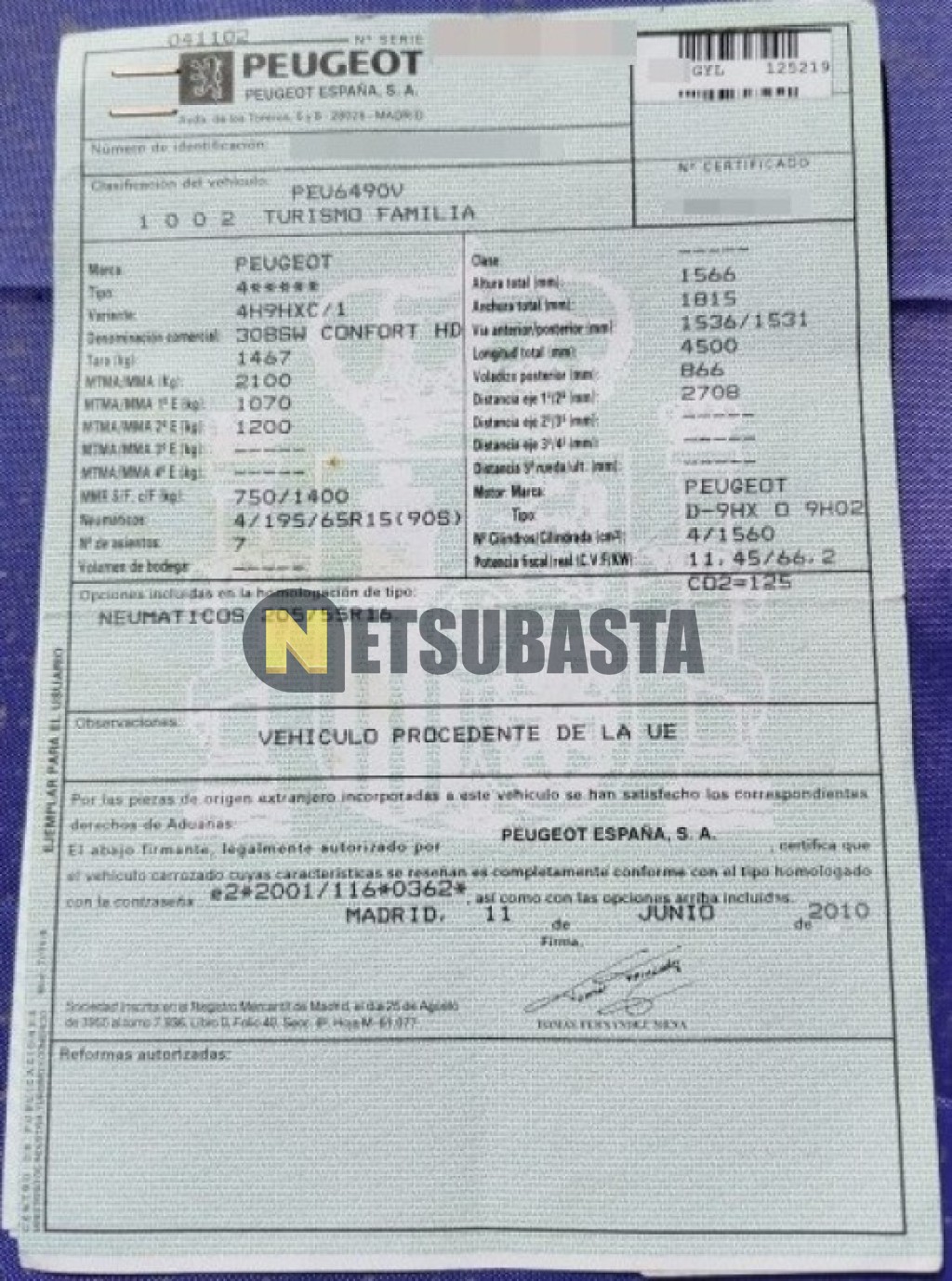 - Modelo:308 SW 1.6 HDi