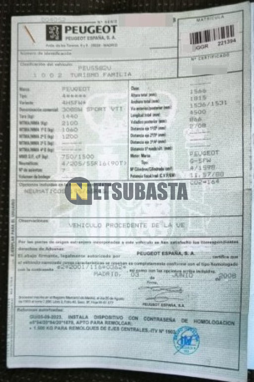 Subasta de Peugeot 308 SW 1.6 VTi 2008 Averiados, Marca Peugeot, Modelo 308 SW 1.6 VTi, Combustible Gasolina, Kilometraje 220.000 KM, Fecha 1ª matriculación 07/2008, Matrícula ****GGR, Color Exterior , Color Interior , IVA REBU y Ubicación Guadalajara.