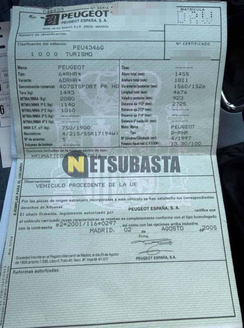 Subasta de Peugeot 407 2.0 HDi 2005 Averiados, Marca Peugeot, Modelo 407 2.0 HDi, Combustible Diésel, Kilometraje 255.000 KM, Fecha 1ª matriculación 10/2005, Matrícula ****DRW, Color Exterior , Color Interior , IVA REBU y Ubicación Valencia.
