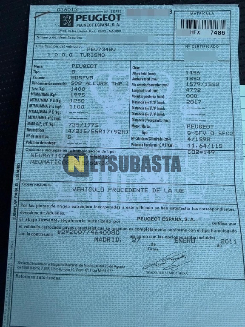 Subasta de Peugeot 508 1.6 THP 2011 Averiados, Marca Peugeot, Modelo 508 1.6 THP, Combustible Gasolina, Kilometraje 200.000 KM, Fecha 1ª matriculación 08/2011, Matrícula ****HFX, Color Exterior , Color Interior , IVA REBU y Ubicación Madrid.