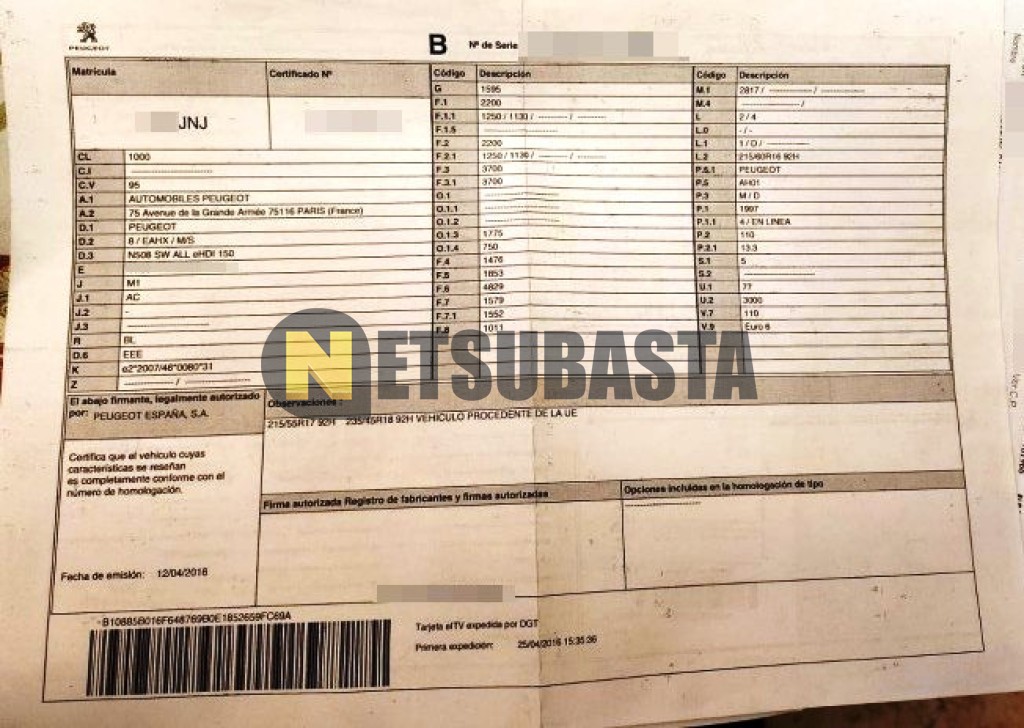 Subasta de Peugeot 508 SW 2.0 BlueHDi 2016 Averiados, Marca Peugeot, Modelo 508 SW 2.0 BlueHDi, Combustible Diésel, Kilometraje 105.000 KM, Fecha 1ª matriculación 04/2016, Matrícula ****JNJ, Color Exterior , Color Interior , IVA REBU y Ubicación Valladolid.