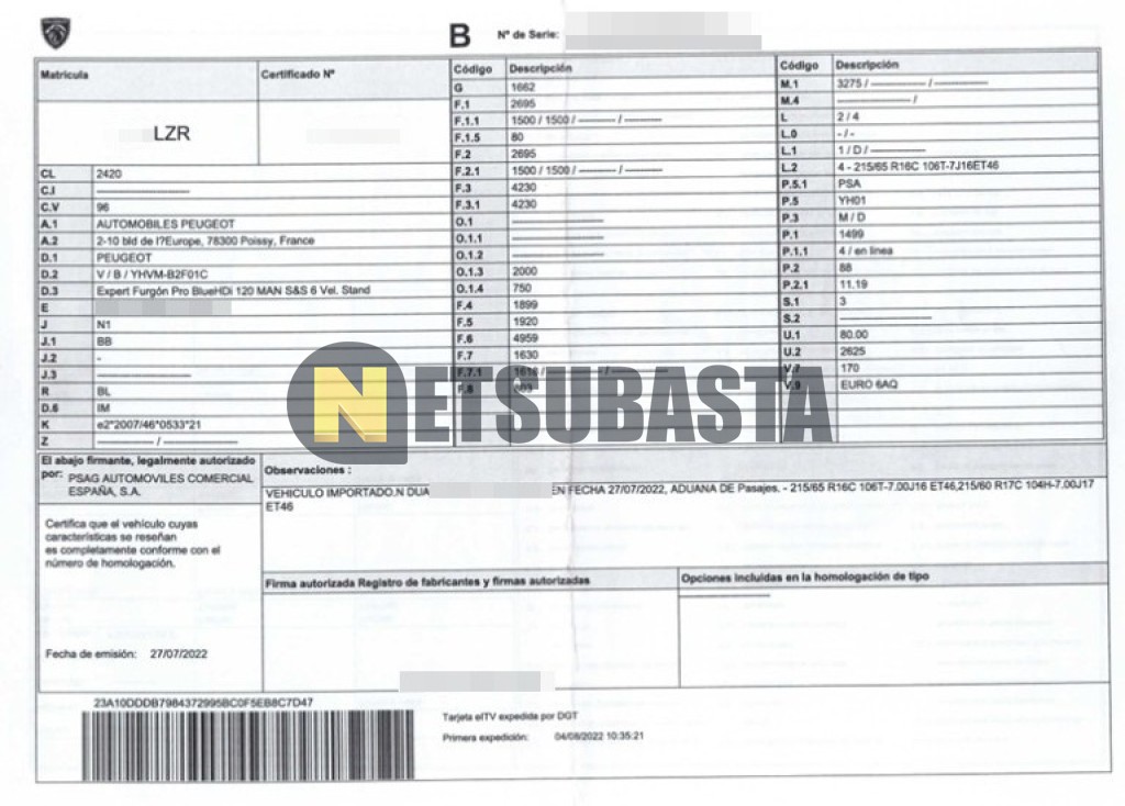 Subasta de Peugeot Expert 1.5 BlueHDi 2022 Siniestrados, Marca Peugeot, Modelo Expert 1.5 BlueHDi, Combustible Diésel, Kilometraje 115.000 KM, Fecha 1ª matriculación 08/2022, Matrícula ****LZR, Color Exterior , Color Interior , IVA IVA Deducible y Ubicación Tarragona.