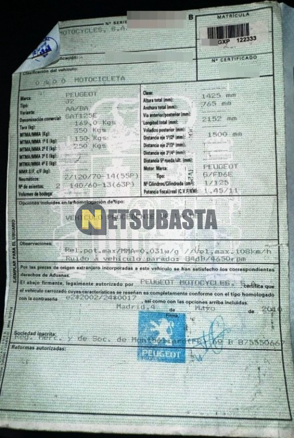 Subasta de Peugeot Satelis 125 2010 Averiados, Marca Peugeot, Modelo Satelis 125, Combustible Gasolina, Kilometraje 81.000 KM, Fecha 1ª matriculación 07/2010, Matrícula ****GXP, Color Exterior , Color Interior , IVA REBU y Ubicación Madrid.
