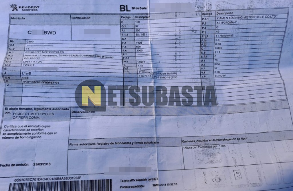 Subasta de Peugeot Tweet 50 2018 Averiados, Marca Peugeot, Modelo Tweet 50, Combustible Diésel, Kilometraje 30.000 KM, Fecha 1ª matriculación 03/2018, Matrícula C****BWD, Color Exterior , Color Interior , IVA REBU y Ubicación Madrid.