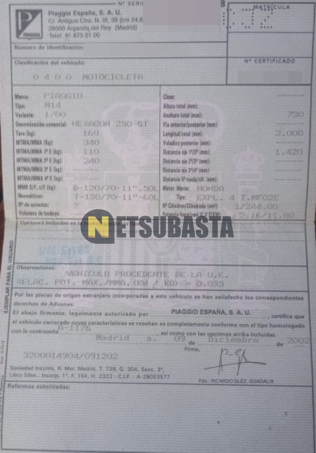 Subasta de Piaggio Hexagon GTX 250 2003 Averiados, Marca Piaggio, Modelo Hexagon GTX 250, Combustible Gasolina, Kilometraje 70.000 KM, Fecha 1ª matriculación 06/2003, Matrícula ****CJZ, Color Exterior , Color Interior , IVA REBU y Ubicación Madrid.