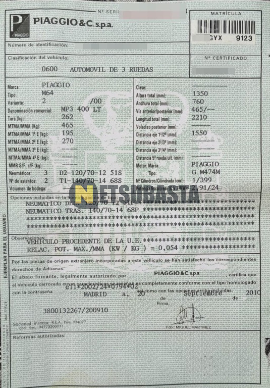 Subasta de Piaggio MP3 LT 400 2010 Siniestrados, Marca Piaggio, Modelo MP3 LT 400, Combustible Gasolina, Kilometraje 115.000 KM, Fecha 1ª matriculación 09/2010, Matrícula ****GYX, Color Exterior , Color Interior , IVA REBU y Ubicación Barcelona.