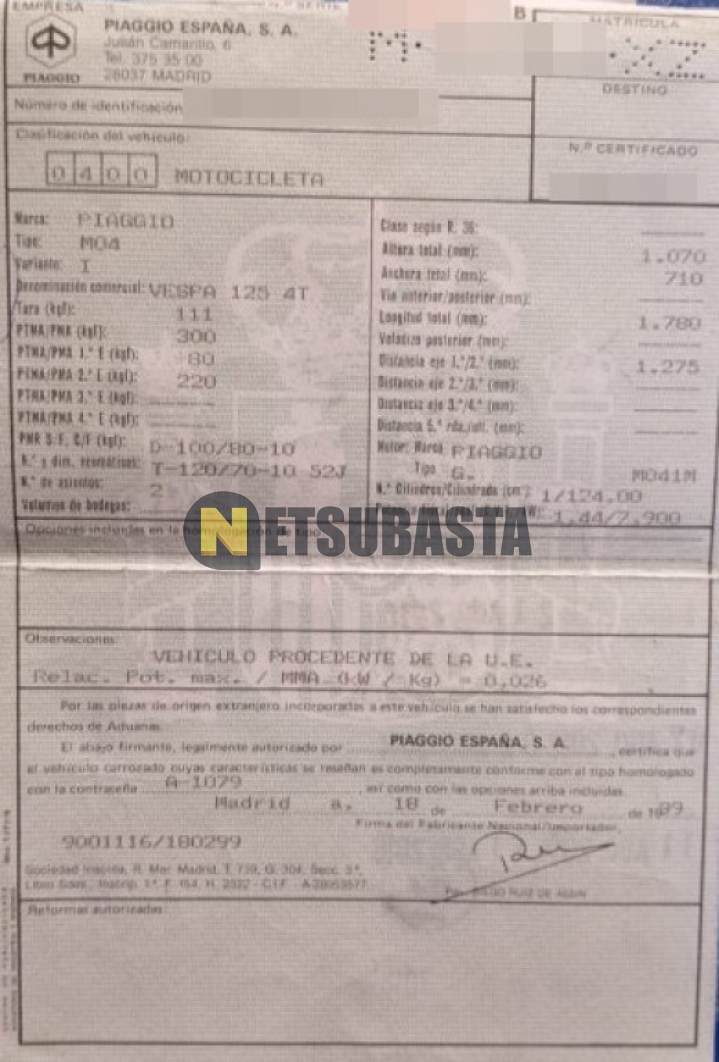 Subasta de Piaggio VESPA 125 1999 Averiados, Marca Piaggio, Modelo VESPA 125, Combustible Gasolina, Kilometraje 12.000 KM, Fecha 1ª matriculación 07/1999, Matrícula M****XZ, Color Exterior , Color Interior , IVA REBU y Ubicación Ávila.