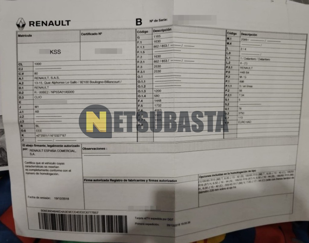 Subasta de Renault Clio 0.9 TCe 2018 Siniestrados, Marca Renault, Modelo Clio 0.9 TCe, Combustible Gasolina, Kilometraje 110.000 KM, Fecha 1ª matriculación 12/2018, Matrícula ****KSS, Color Exterior , Color Interior , IVA REBU y Ubicación Sevilla.