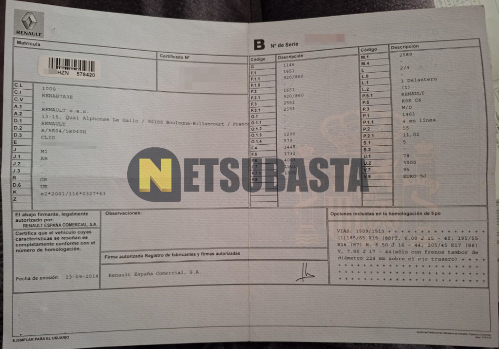 Subasta de Renault Clio 1.5 dCi 2014 Siniestrados, Marca Renault, Modelo Clio 1.5 dCi, Combustible Diésel, Kilometraje 220.000 KM, Fecha 1ª matriculación 10/2014, Matrícula ****HZN, Color Exterior , Color Interior , IVA REBU y Ubicación Valencia.