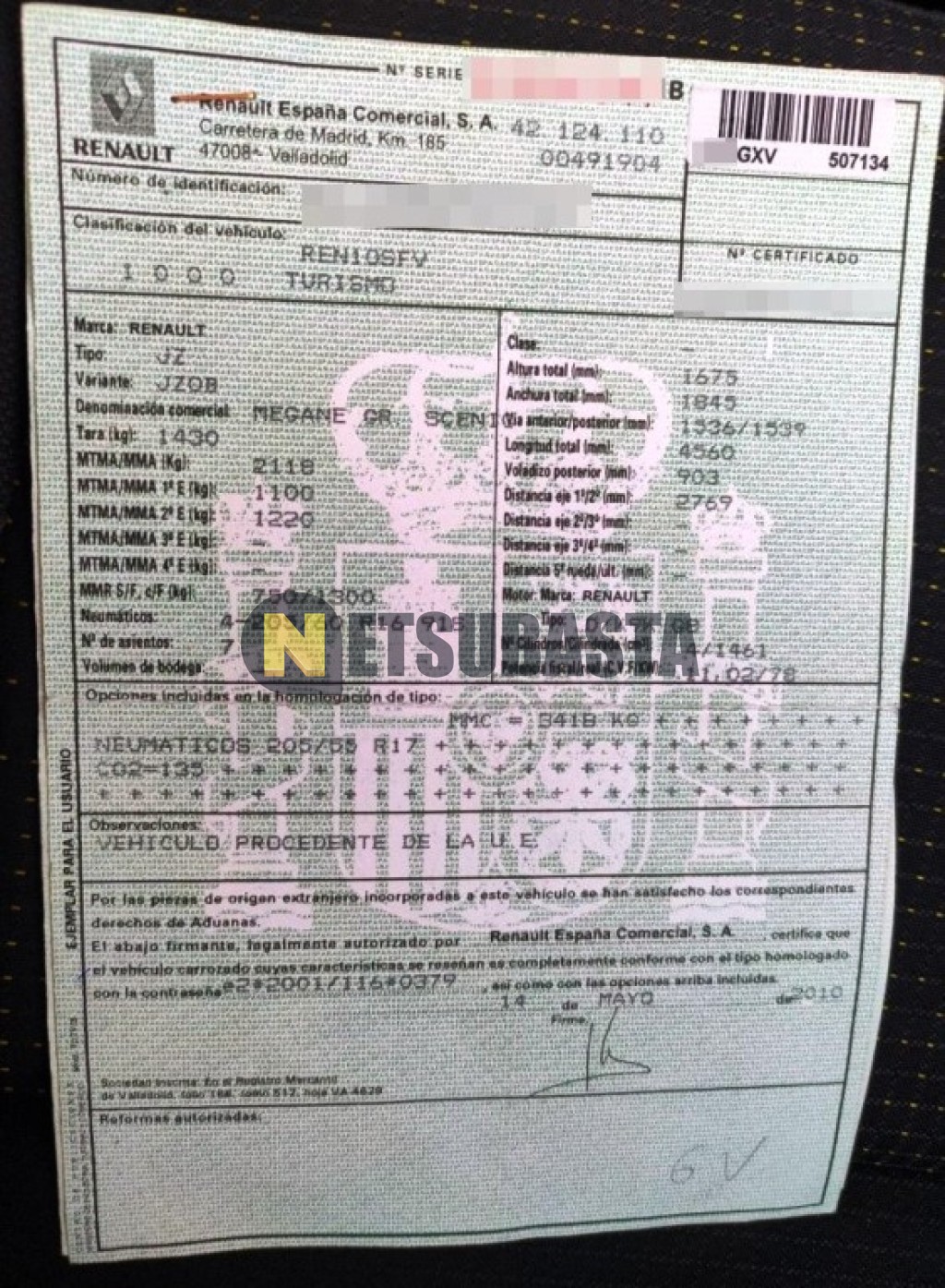 Subasta de Renault Grand Scenic 1.5 dCi 2010 Averiados, Marca Renault, Modelo Grand Scenic 1.5 dCi, Combustible Diésel, Kilometraje 242.000 KM, Fecha 1ª matriculación 07/2010, Matrícula ****GXV, Color Exterior , Color Interior , IVA REBU y Ubicación Vizcaya.
