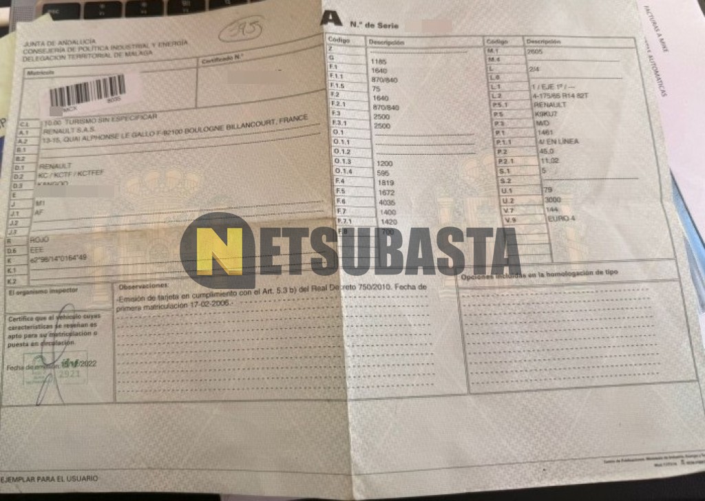 Subasta de Renault Kangoo 1.5 dCi 2006 Siniestrados, Marca Renault, Modelo Kangoo 1.5 dCi, Combustible Diésel, Kilometraje 370.000 KM, Fecha 1ª matriculación 02/2006, Matrícula ****MCX, Color Exterior , Color Interior , IVA REBU y Ubicación Málaga.