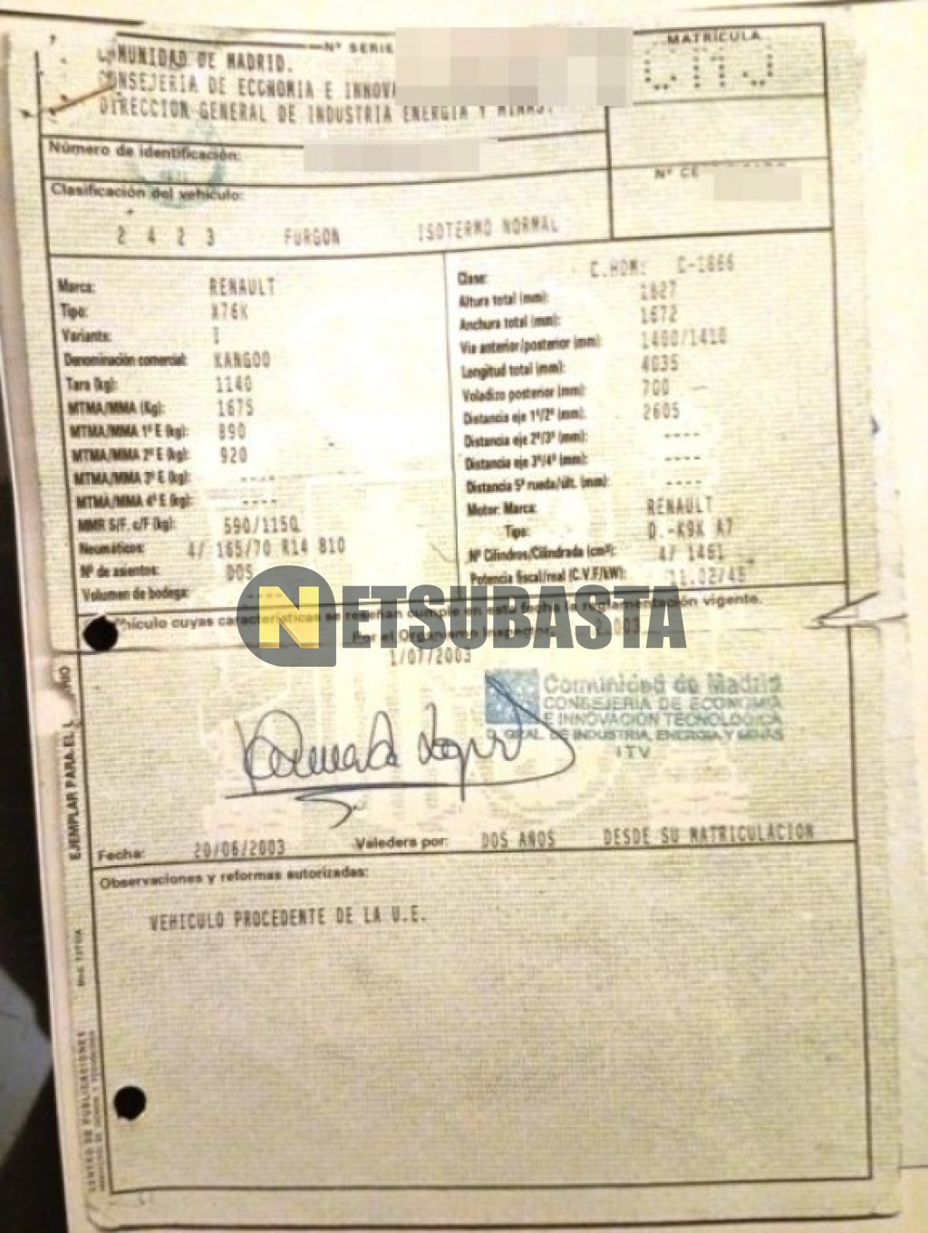 Subasta de Renault Kangoo 1.5 dCi Isotermo 2003 Averiados, Marca Renault, Modelo Kangoo 1.5 dCi Isotermo, Combustible Diésel, Kilometraje 538.000 KM, Fecha 1ª matriculación 10/2003, Matrícula ****CNJ, Color Exterior , Color Interior , IVA REBU y Ubicación Madrid.