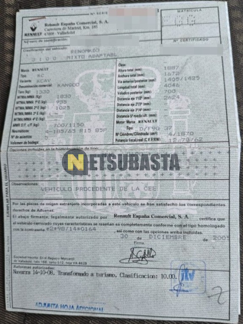 Subasta de Renault Kangoo 1.9 dCi 4X4 2006 Averiados, Marca Renault, Modelo Kangoo 1.9 dCi 4X4, Combustible Diésel, Kilometraje 254.000 KM, Fecha 1ª matriculación 10/2006, Matrícula ****FGG, Color Exterior , Color Interior , IVA REBU y Ubicación Navarra.