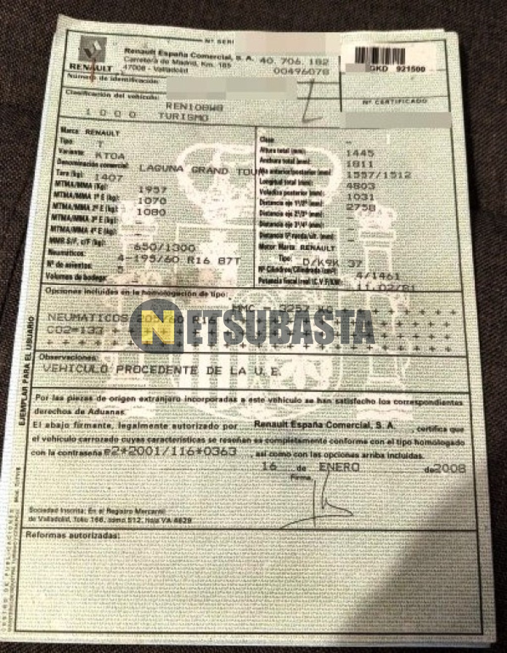 Subasta de Renault Laguna Grand Tour 1.5 dCi 2008 Averiados, Marca Renault, Modelo Laguna Grand Tour 1.5 dCi, Combustible Diésel, Kilometraje 230.000 KM, Fecha 1ª matriculación 12/2008, Matrícula ****GKD, Color Exterior , Color Interior , IVA REBU y Ubicación Cuenca.