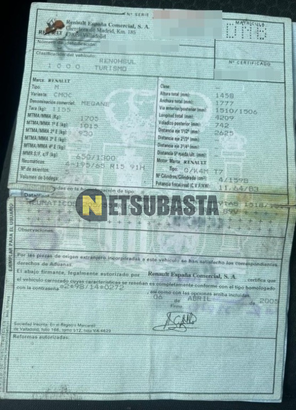 Subasta de Renault Megane 1.6 2005 Averiados, Marca Renault, Modelo Megane 1.6, Combustible Gasolina, Kilometraje 230.000 KM, Fecha 1ª matriculación 07/2005, Matrícula ****DNB, Color Exterior , Color Interior , IVA REBU y Ubicación Tarragona.