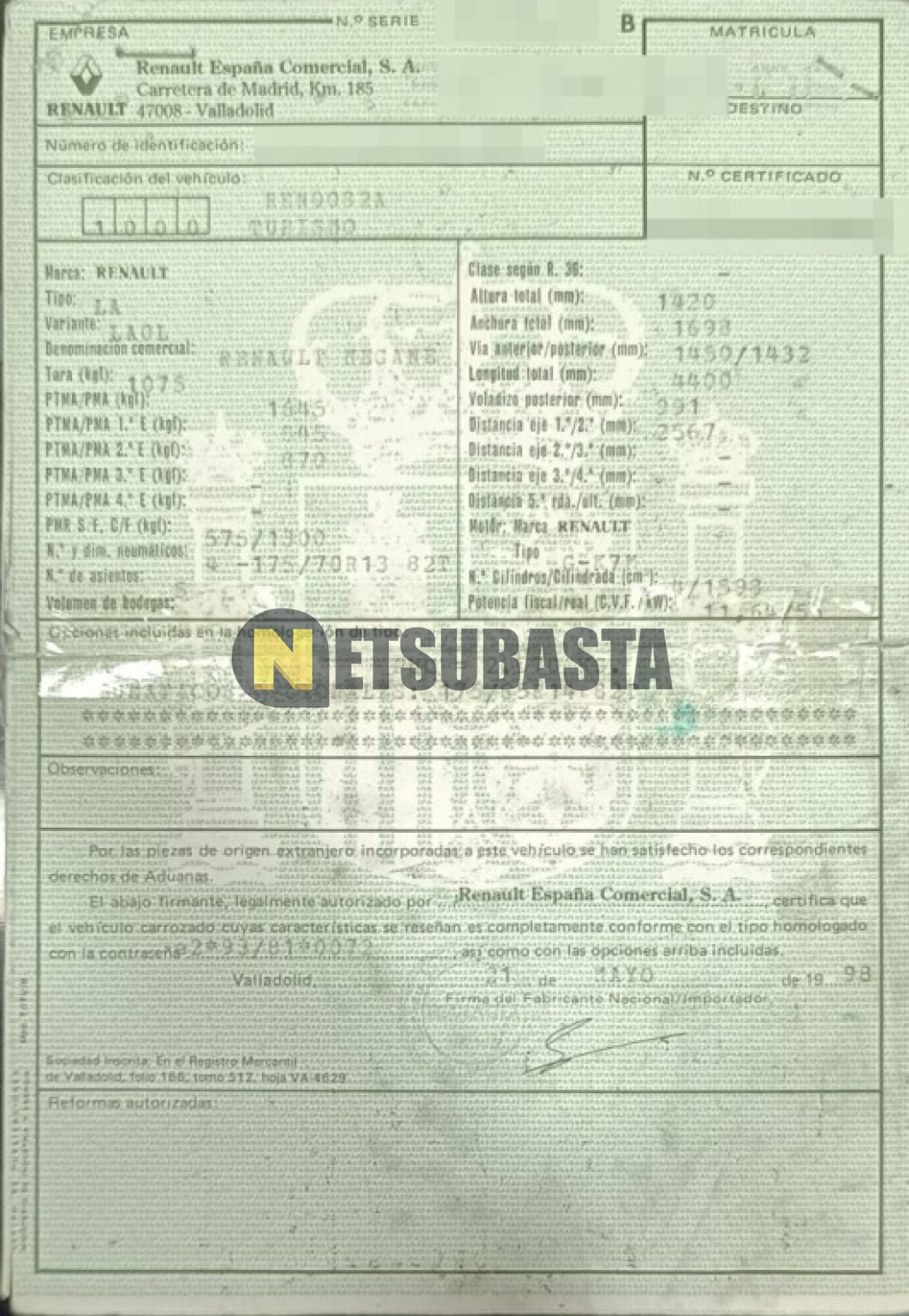 Subasta de Renault Megane 1.6i 1998 Averiados, Marca Renault, Modelo Megane 1.6i , Combustible Gasolina, Kilometraje 62.000 KM, Fecha 1ª matriculación 06/1998, Matrícula SE****DB, Color Exterior , Color Interior , IVA REBU y Ubicación Sevilla.