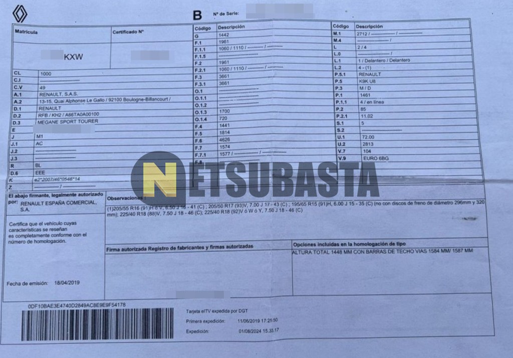 Subasta de Renault Megane Sport Tourer 1.5 Blue dCi 2019 Siniestrados, Marca Renault, Modelo Megane Sport Tourer 1.5 Blue dCi, Combustible Diésel, Kilometraje 138.000 KM, Fecha 1ª matriculación 06/2019, Matrícula ****KXW, Color Exterior , Color Interior , IVA REBU y Ubicación Cuenca.