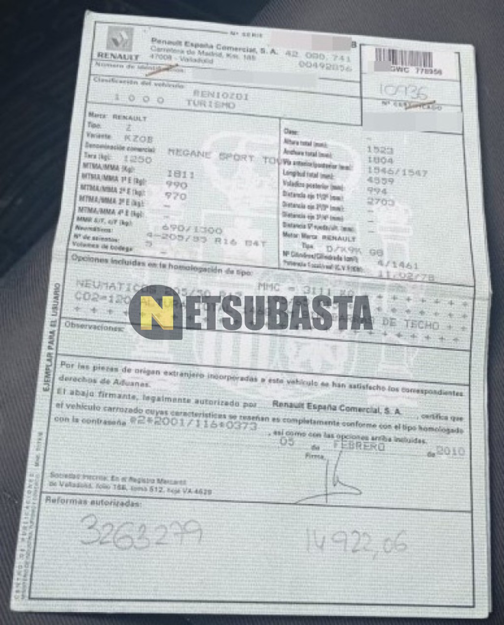 Subasta de Renault Megane Sport Tourer 1.5 dCi 2010 Siniestrados, Marca Renault, Modelo Megane Sport Tourer 1.5 dCi , Combustible Diésel, Kilometraje 350.000 KM, Fecha 1ª matriculación 04/2010, Matrícula ****GWC, Color Exterior , Color Interior , IVA REBU y Ubicación Sevilla.