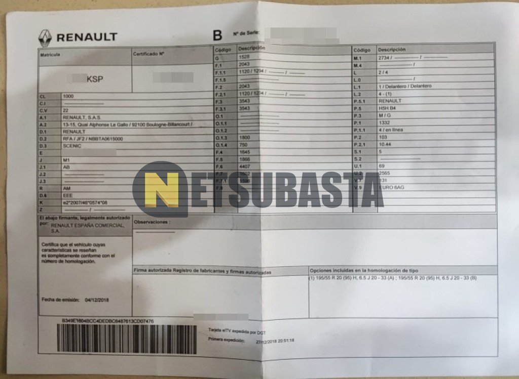 Subasta de Renault Scenic 1.3 TCe EDC GPF 2018 Siniestrados, Marca Renault, Modelo Scenic 1.3 TCe EDC GPF, Combustible Gasolina, Kilometraje 70.000 KM, Fecha 1ª matriculación 12/2018, Matrícula ****KSP, Color Exterior , Color Interior , IVA REBU y Ubicación Sevilla.