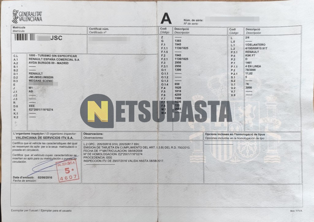 Subasta de Renault Scenic 1.5 dCi 2006 Siniestrados, Marca Renault, Modelo Scenic 1.5 dCi, Combustible Diésel, Kilometraje 285.000 KM, Fecha 1ª matriculación 08/2006, Matrícula ****JSC, Color Exterior , Color Interior , IVA REBU y Ubicación Castellón.