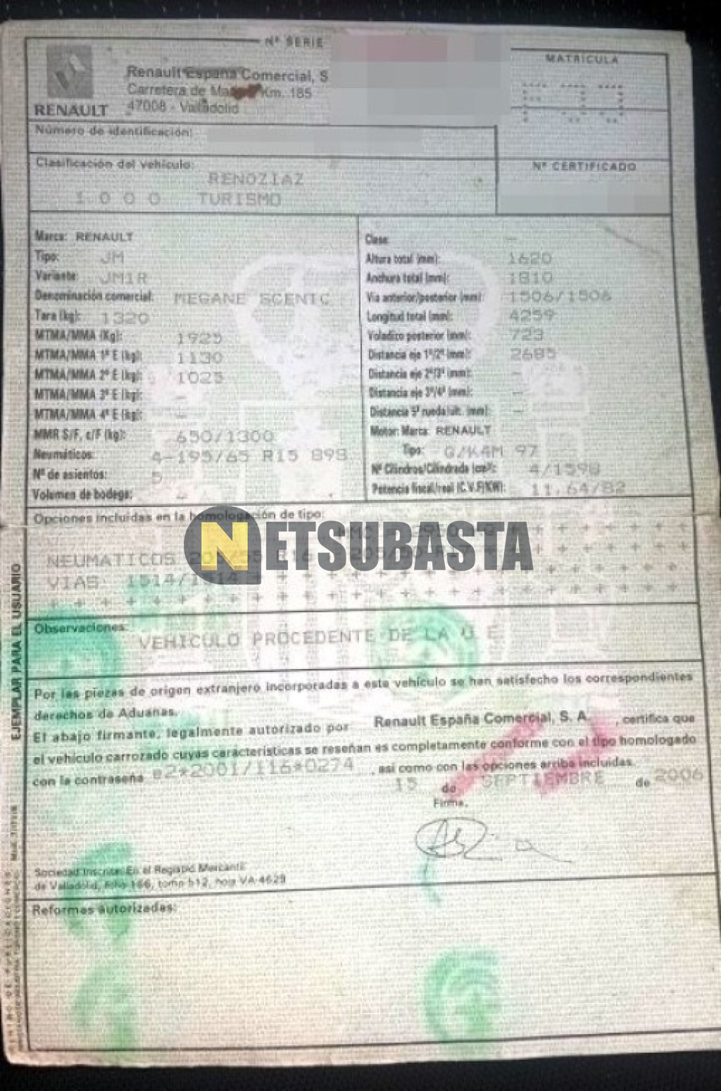 Subasta de Renault Scenic 1.6 16v 2006 Averiados, Marca Renault, Modelo Scenic 1.6 16v, Combustible Gasolina, Kilometraje 170.000 KM, Fecha 1ª matriculación 12/2006, Matrícula ****FJJ, Color Exterior , Color Interior , IVA REBU y Ubicación Cádiz.